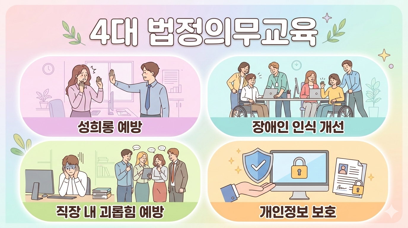 4대 법정의무교육(성희롱, 장애인 인식개선, 직장 내 괴롭힘, 개인정보)
